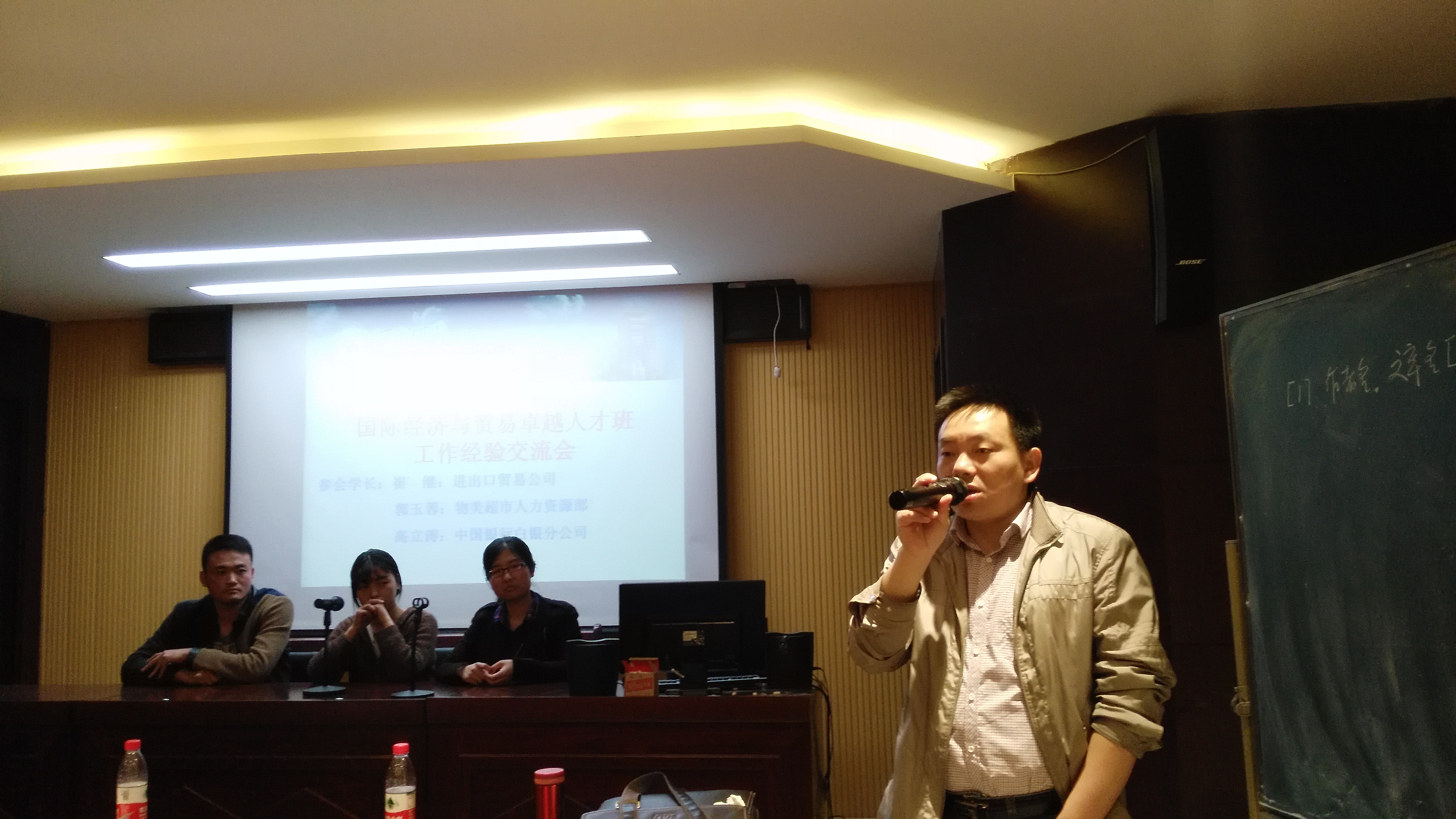 4月25日晚,8797威尼斯老品牌在教学10号楼C区418会议室举行了“国际经济与贸易卓越人才班工作经验交流会”,2013级和2014级国际经济与贸易卓越人才班全体同学参加参加了此次会议,会议由陈开军老师主持,邀请2011级崔继、 郭玉蓉 、高立涛同学分享求职经验,传授技巧。