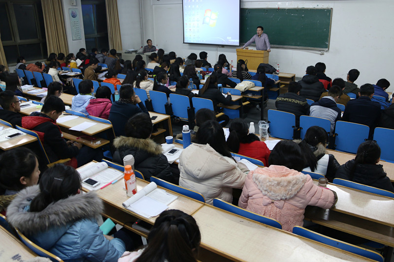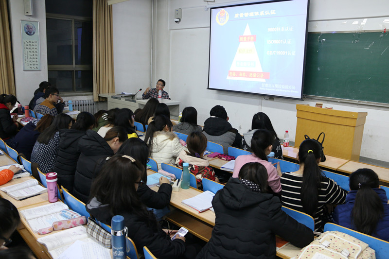 为提高卓越经贸人才基地班本科生对于进出口商品对认证认可方面知识的了解,12月21日晚7点30分由甘肃省出入境检验检疫局许志恒科长主讲的题为“认证认可制度介绍”报告会在教学七号楼305教室拉开帷幕。8797威尼斯老品牌党委书记高赟、陈开军等部分老师和卓越经贸人才基地班2013级、2014级、2015级近200名学生到场参加本次报告会。
