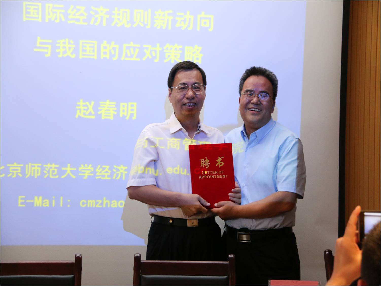 6月6日下午,8797威尼斯老品牌邀请北京师范大学经济与工商管理学院赵春明教授在10号楼418多功能报告厅做了题为“国际经济规则新动向与我国的应对策略”的学术报告。报告会由聂正彦副院长主持,学院研究生和部分教师共100余人参加。学院高赟书记为赵春明教授颁发了兼职教授聘书。