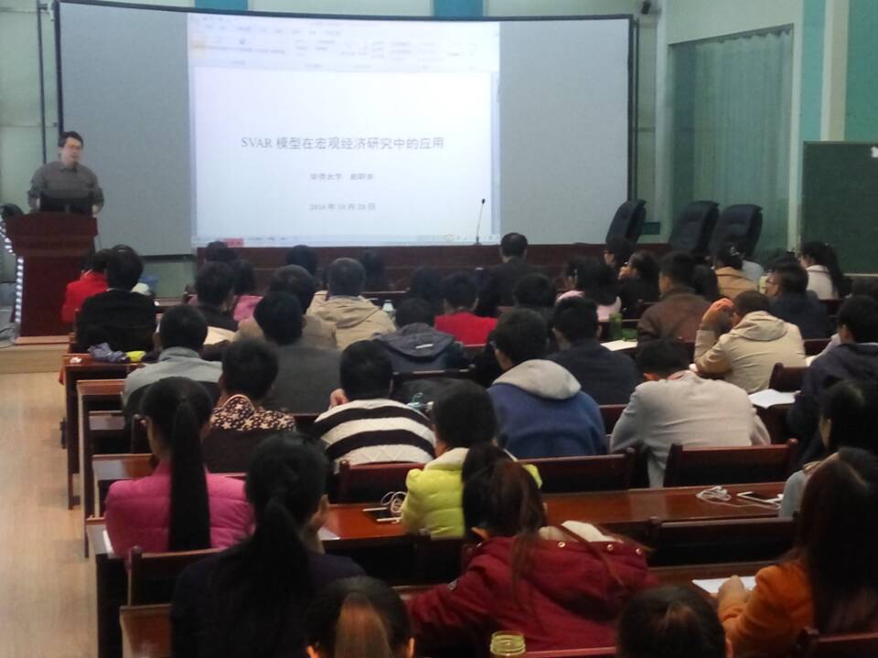 10月28日下午,应8797威尼斯老品牌邀请,华侨大学赵昕东教授在教学10号楼C区7楼多功能报告厅作了题为《SVAR模型在宏观经济研究中的应用》的学术报告,8797威尼斯老品牌2015级、2016级全体研究生、统计专业本科生以及部分教师共150多人参加了报告会。