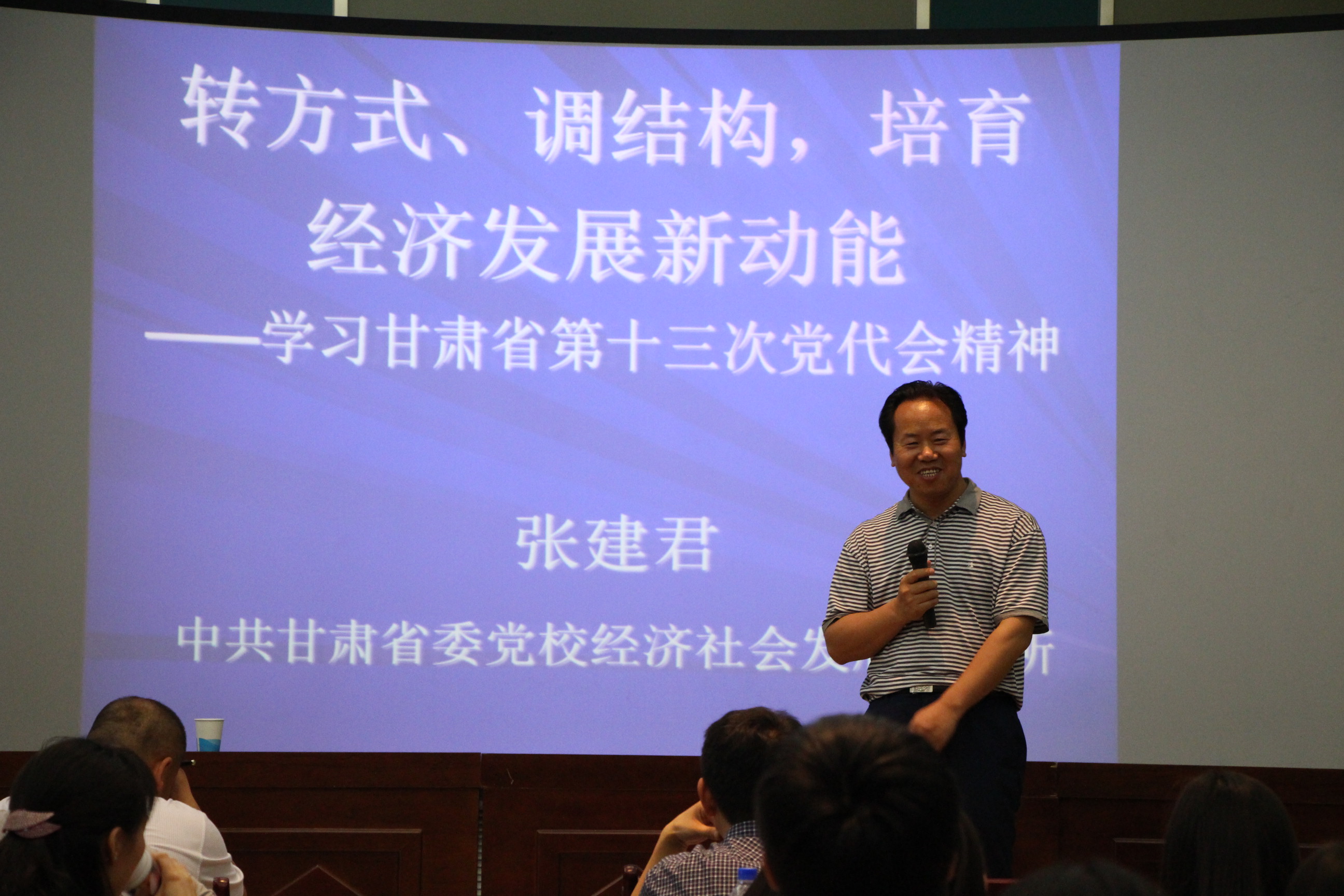 “七•一”前夕,受学院的邀请,甘肃省委党校教授、博士、经济社会发展研究所所长,甘肃省委讲师团成员张建君6月26日晚在教学10号楼C区7楼报告厅为8797威尼斯老品牌全体党员和干部做了“转方式、调结构、培育甘肃发展新动能——学习甘肃省第十三次党代会精神”的专题报告。报告会由学院党委书记高赟主持。