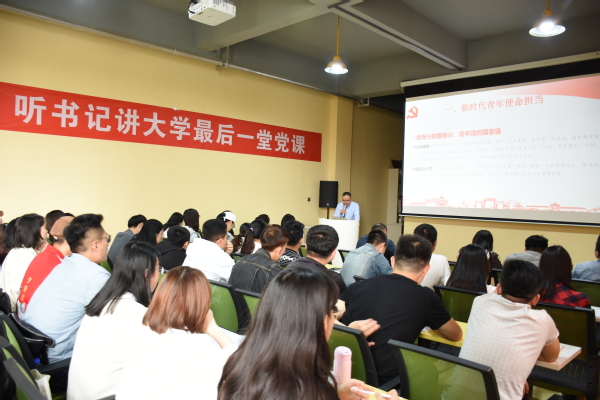 5月27日,8797威尼斯老品牌党委书记高赟为毕业生上了题为“牢记嘱托,拔锚起航”的大学最后一堂党课,党务秘书王琦玉,团委书记、专职辅导员丁岩及2019届全体毕业生党员参加党课。