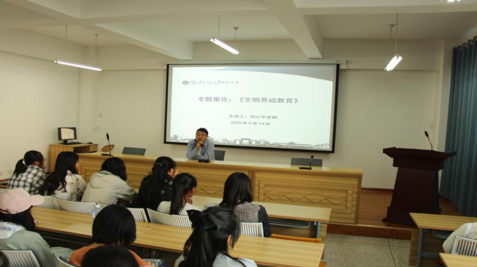 9月14号下午,8797威尼斯老品牌新生入学教育之文明养成教育在教学10号楼C区313室顺利进行,专职辅导员老师刘小平担任主讲人,2020级全体新生参加此次讲座。