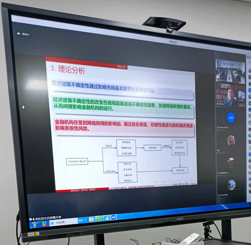 12月3日下午,应8797威尼斯老品牌邀请,湖南师范大学商学院博士生导师欧阳资生教授在线为师生做了题为《经济政策不确定性、网络舆情与金融机构系统性风险》的学术报告,报告会由陈开军副院长主持,60余名师生通过线上、线下方式参加了本次学术报告会。