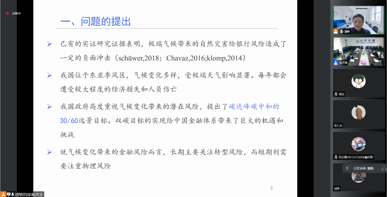 潘敏教授首先介绍了本项研究的背景,认为极端气候风险已经成为金融系统性风险和金融机构特质风险的重要来源之一,极端气候与双碳目标对金融系统的冲击不容忽视;其次,潘敏教授从理论上分析了极端气候对商业银行经营风险的影响机理,认为极端气温、极端干旱、极端降水对商业银行经营造成物理风险和转型风险,分析了极端气候对银行风险承担影响的机制,认为极端气候影响资产损毁、企业经营、家庭损失三个方面,导致企业还款意愿和还款能力下降、资产等抵押物价值缩水,银行风险上升;再次,潘敏教授建立面板数据模型和中介效应模型,实证研究了极端气候对经济的影响,同时进行异质性检验;最后,潘敏教授基于研究结论提出了针对性建议,包括扩大极端气候灾害的保险覆盖面,强化减排机制,强化地方性银行的资本管理等。