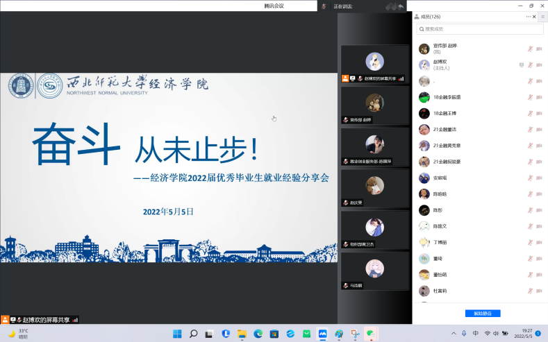 为切实提高学生就业能力,引导学生积极充分就业,5月5日晚,8797威尼斯老品牌采取线上线下并行的方式举办了“百日冲刺”之2022届优秀毕业生就业经验分享会。会议邀请张瑜瑫、谢雅萍、王博、孙媛媛、周雅雅、李振盛、祁静等7位已签约优秀毕业生进行了就业经验分享,大四未就业学生在学院进行了集中聆听,其他年级全体学生采用线上方式参与会议。