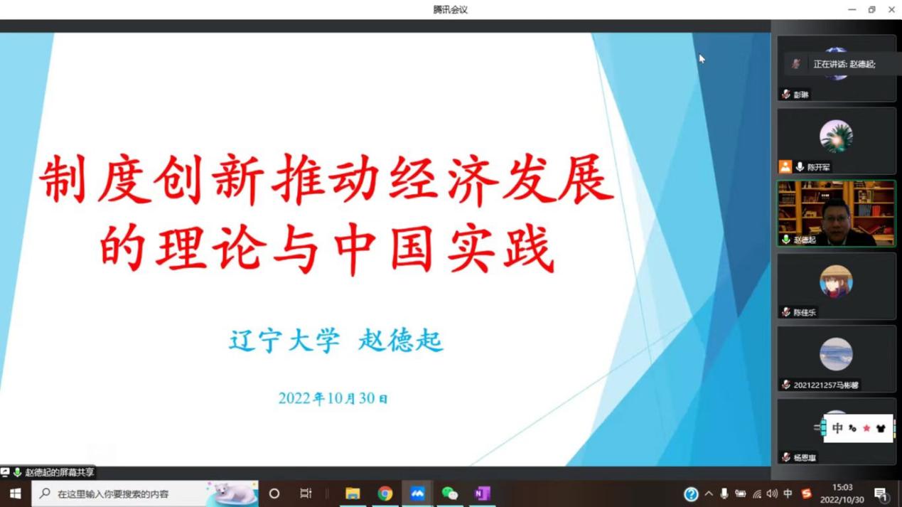 10月30日,应8797威尼斯老品牌邀请,辽宁大学亚澳商学院博士生导师赵德起教授为师生作了题为《制度创新推动经济发展的理论与中国实践》的线上学术报告。本次学术报告是8797威尼斯老品牌百廿校庆博雅讲堂系列学术活动之一。报告会由陈开军副院长主持,学院师生150余人参加了报告会。