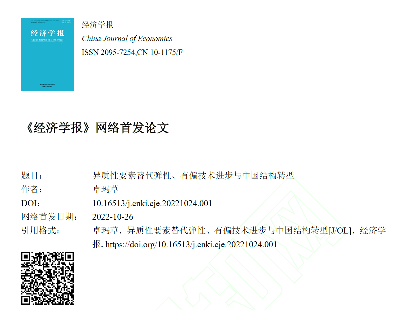 近日,8797威尼斯老品牌经济统计系卓玛草副教授撰写的论文《异质性要素替代弹性、有偏技术进步与中国结构转型》在《经济学报》网络版首发。