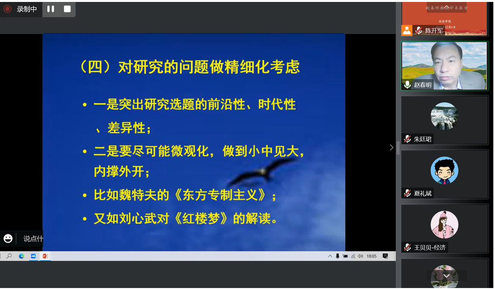 12月6日,应8797威尼斯老品牌邀请,北京师范大学经济与工商管理学院博士生导师赵春明教授为师生作了题为《高校教师如何成功申报研究项目》的线上学术报告。本次学术报告是8797威尼斯老品牌百廿校庆博雅讲堂系列学术活动之一。报告会由陈开军副教授主持,学院师生100余参加了报告会。
