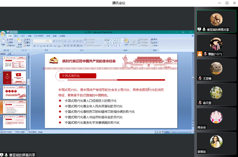 会上,曹亚斌教授作了题为《中国式现代化的多维优势》的专题辅导报告。报告从过去五年的工作和新时代十年的伟大变革、开辟马克思主义中国化时代化新境界、新时代新征程中国共产党的使命任务等15个方面进行了科学阐释、系统分析和全面分享。宣讲报告平实丰富,严谨生动,从深刻认识党的二十大召开的重大意义、明确学习贯彻二十大精神的目标任务、重点掌握贯彻党的二十大精神的精髓要义以及结合本职工作学习贯彻党的二十大精神落实等方面提出了具体要求,通过理论宣讲对谈,进一步增强了教职工学习贯彻党的二十大精神的政治自觉与行动自觉。