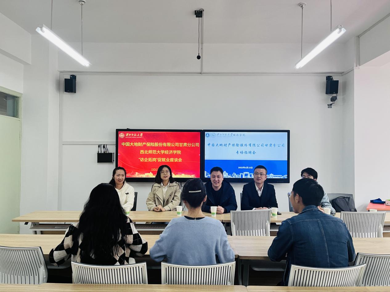 4月10日,学院与中国大地财产保险股份有限公司甘肃分公司进行“访企拓岗”暨中国大地财产保险股份有限公司甘肃分公司专场招聘会。大地财险员工管理与培训发展室主任樊帅、兰州中支综合部负责人石芸芸、临夏中支综合部负责人段辉强及学院党委副书记谢田玲、辅导员汪晟、曹若华参加此次活动。樊主任就大地财险公司发展、招聘专业需求、员工待遇等方面做了介绍。谢书记就学院2023届毕业生规模、专业方向等方面做了介绍,并希望双方能够加强交流,推动校企深层次合作。
