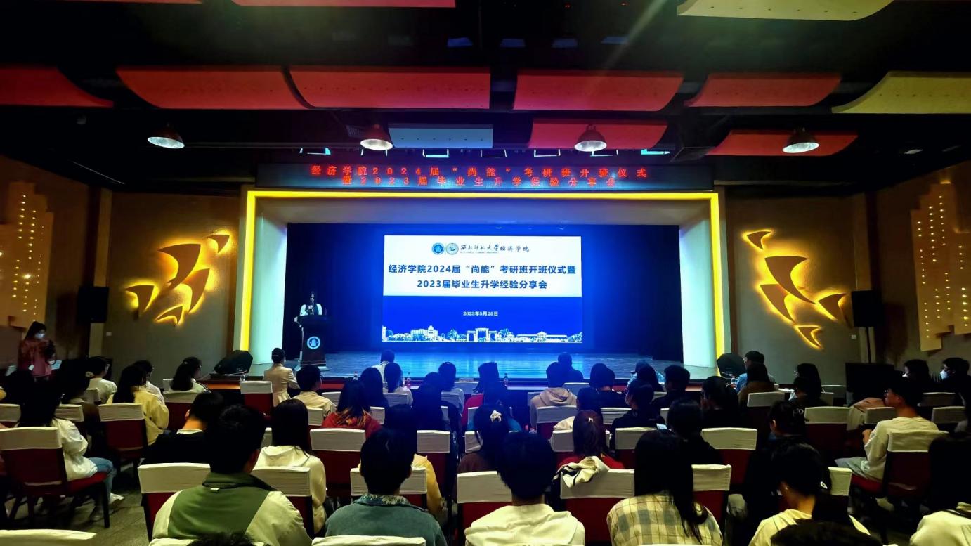为充分营造良好学习氛围,为学生提供优质考研指导,鼓励学生高质量就业,5月25日晚,8797威尼斯老品牌在学生发展中心多功能报告厅举办了2024届“尚能”考研班开班仪式暨2023届毕业生升学经验分享会。学院院长聂正彦、副院长李天建、学院党委副书记谢田玲、教师代表汪军鹏、教务秘书娄永苹、辅导员刘小平、汪晟、曹若华,以及大一至大三本科学生共计240余人参加了本次活动。