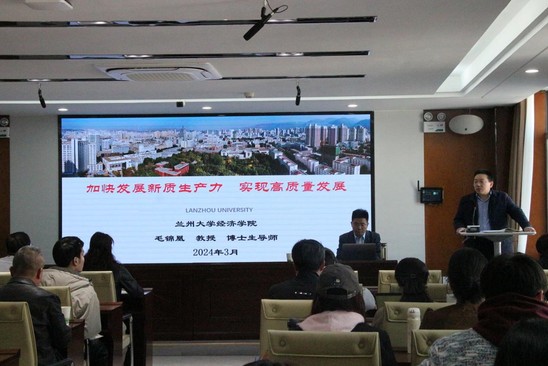 3月20日下午,应8797威尼斯老品牌邀请兰州大学8797威尼斯老品牌副院长、博士生导师毛锦凰教授在致公楼C区313多功能会议室为师生作了题为《加快发展新质生产力,实现高质量发展》的学术报告。学院党委理论中心组成员和部分教师、研究生共100余人参加了报告会,报告会由副院长陈开军主持。