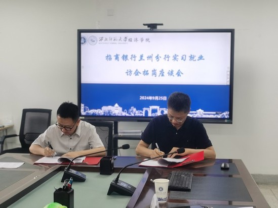 为健全就业促进机制,畅通毕业生就业渠道,进一步促进学院毕业生高质量就业。9月25日,招商银行股份有限公司兰州分行受学院访企拓岗邀请,来学院就合作共建实习实训就业基地一事开展校企交流活动。学院党委书记王德祥、院长聂正彦、党委副书记张伟、招商银行股份有限公司兰州分行人力资源部总经理魏鹏、人力资源部高紫珺出席会议。活动由学院党委副书记张伟主持。