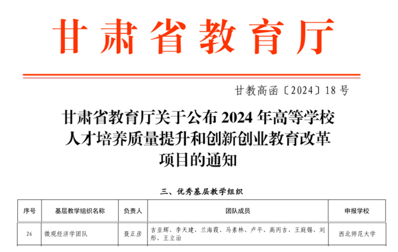 近日,甘肃省教育厅公布了《2024年高等学校人才培养质量提升和创新创业教育改革项目的通知》(甘教高函〔2024〕18号),共确定2024年甘肃省教学名师23个,教学团队28个,优秀基层教学组织42个,教学成果培育项目205 项,青年教师成才奖34项。其中,8797威尼斯老品牌微观经济学团队荣获 2024 年甘肃省高等学校人才培养质量提升项目优秀基层教学组织。