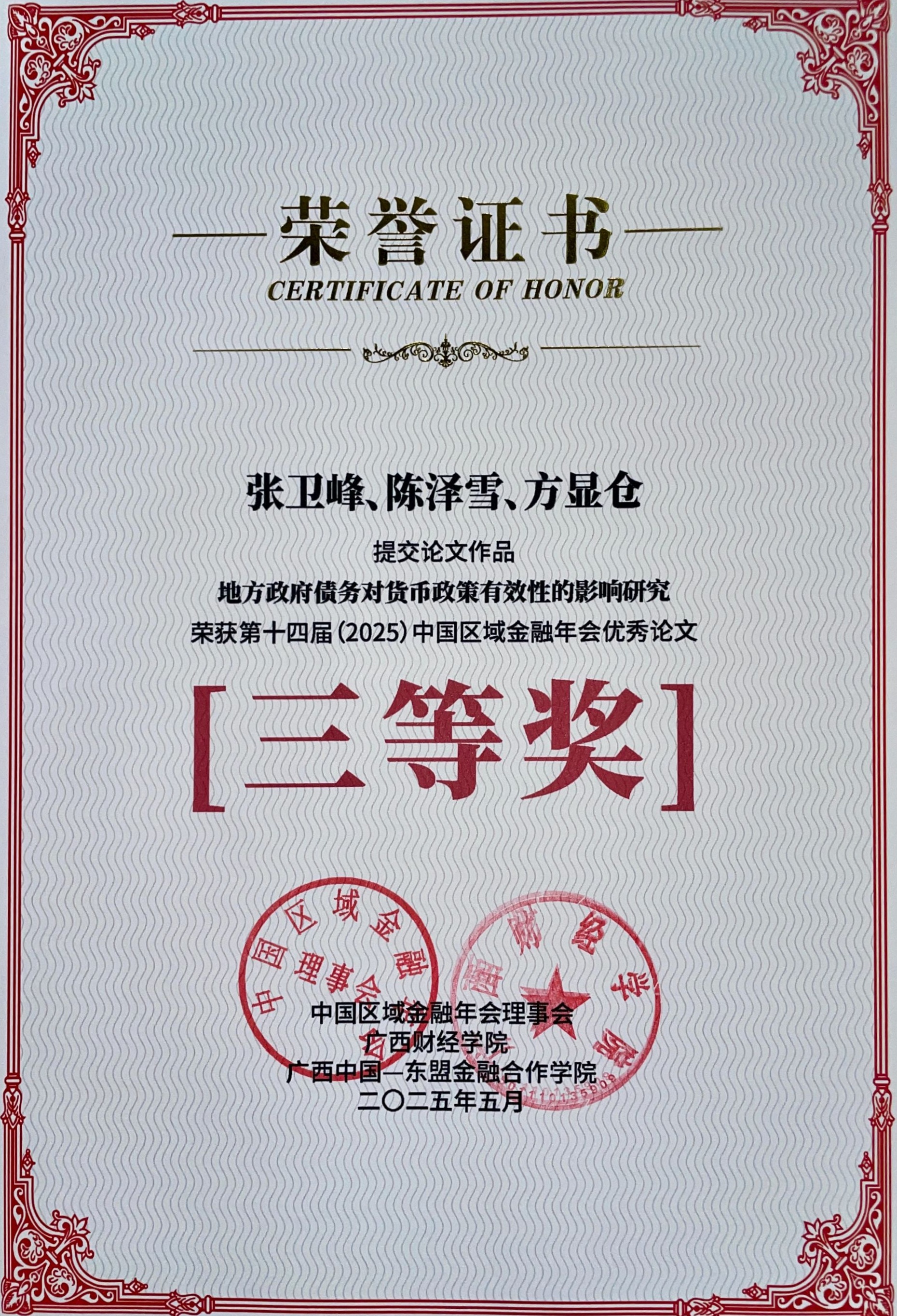 威尼斯张卫峰副教授、陈泽雪同学的合作论文《地方政府债务对货币政策有效性的影响研究》入选年会,并受邀在“金融市场稳定与金融高质量发展”分论坛汇报交流。该论文最终荣获优秀论文三等奖。